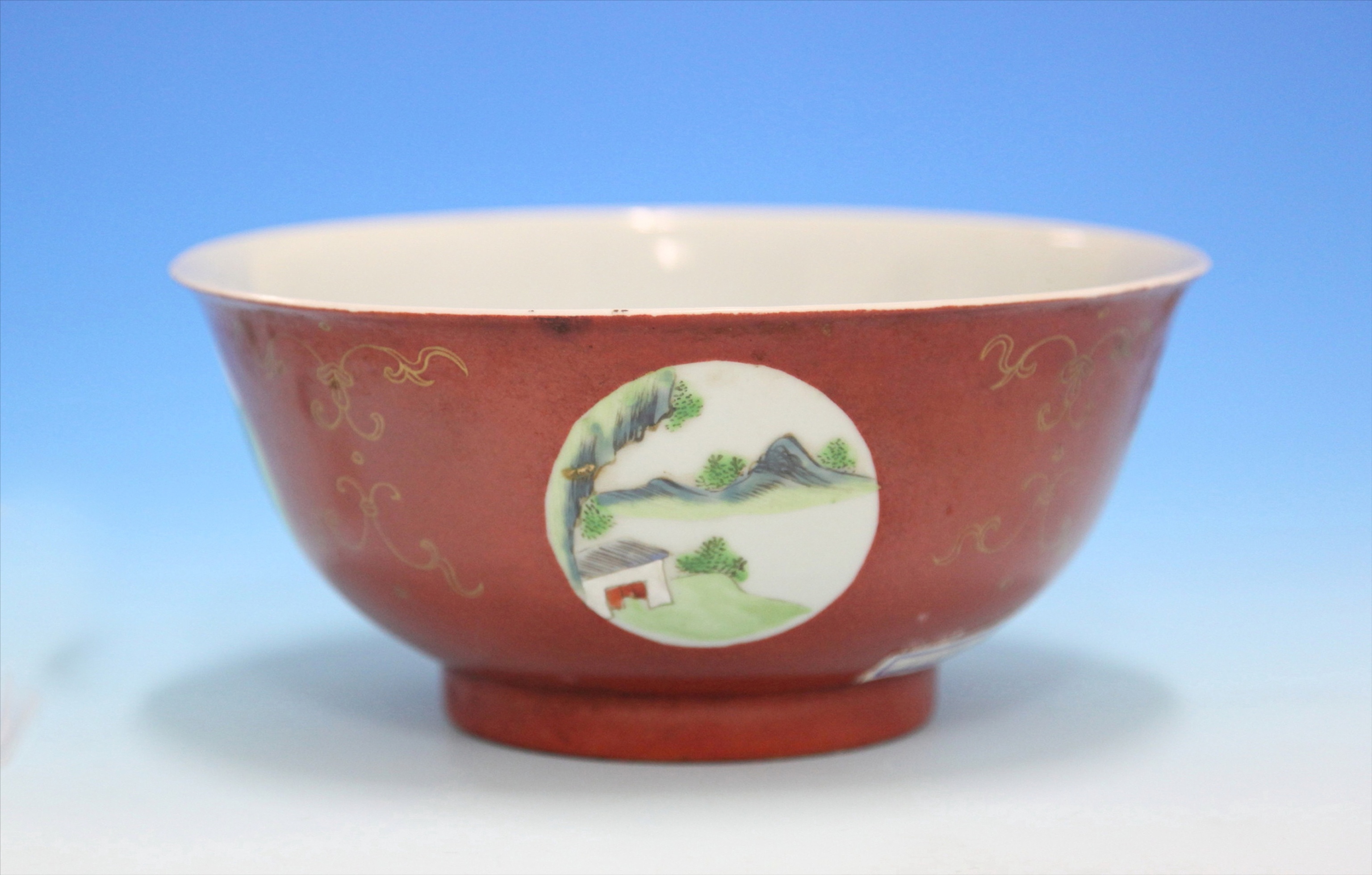 清矾红开光粉彩山水纹瓷碗