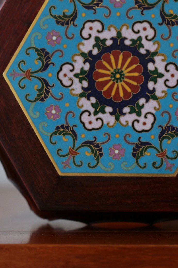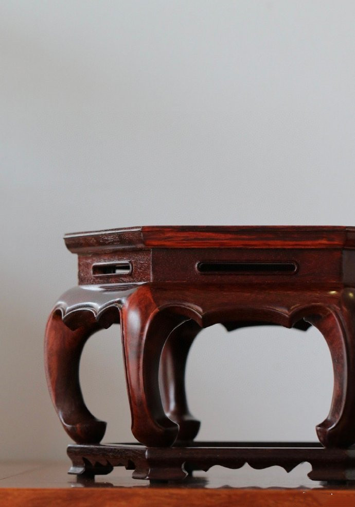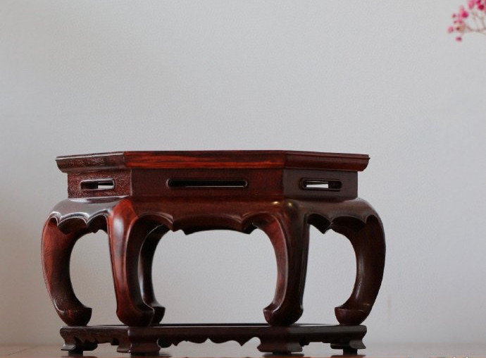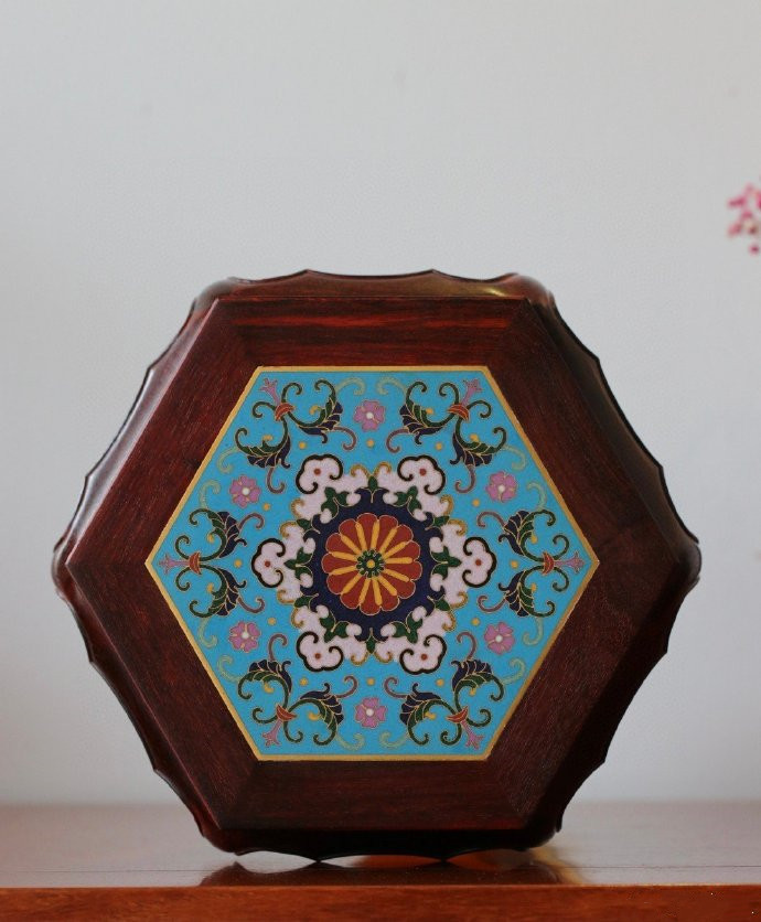 造型简洁素雅,面板六面攒边,嵌纯手工紫铜胎景泰蓝面板。榫卯严密,线条顺畅。可承托瓷器,盆景和香炉等,为屋添趣。22.8*20.8*13.8cm高