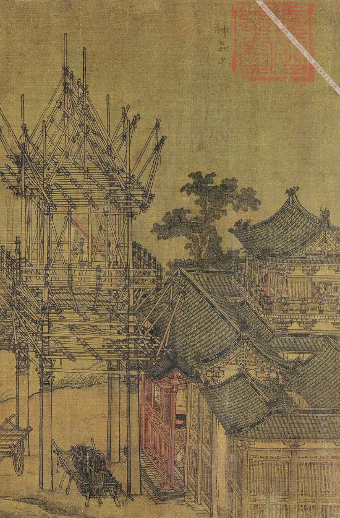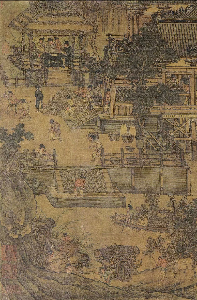 此卷以“航拍”视角描绘了古代粮食加工的过程。水流推动磨盘运转,农夫们或磨面或赶车,岸上有运送面粉的马车,河里有运送货物的船,整幅画似一个分工明确、水陆并用的半自动化粮食加工线,是研究宋代山水、建筑、机械、水利、舟船、服饰的重要资料。
