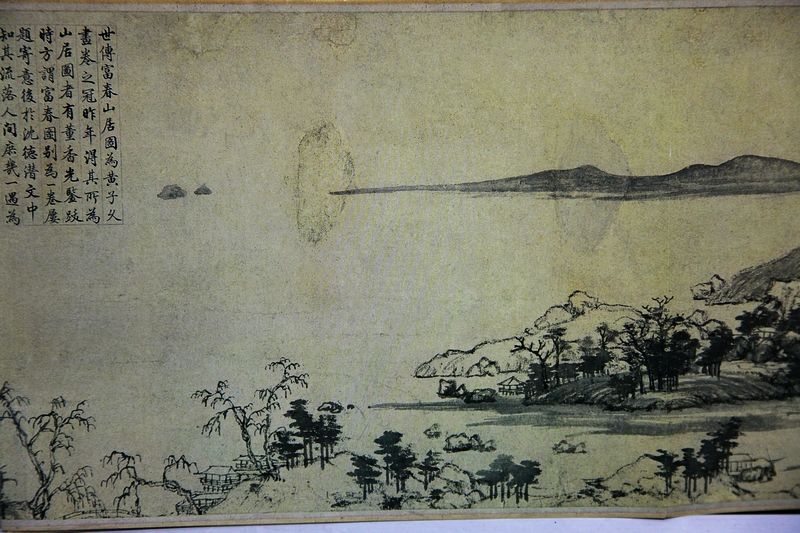 清代顺治七年(西元一六五零年),经历三百年,收藏家吴洪裕得到《富村山居图》长卷,爱不释手,临终不能瞑目,下令侄儿火殉,这张画因此烧断。吴洪裕无子,他的侄儿从火里抢救出来,将烧断的前端五十一公分重裱,取名为《剩山图》。目前收藏在浙江博物馆,后面五分之四长达约六百四十公分收藏在台北故宫。