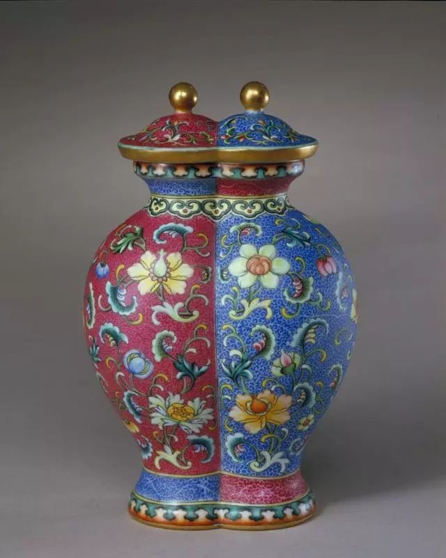 清乾隆胭脂红、蓝地轧道珐琅彩折枝花纹合欢瓶