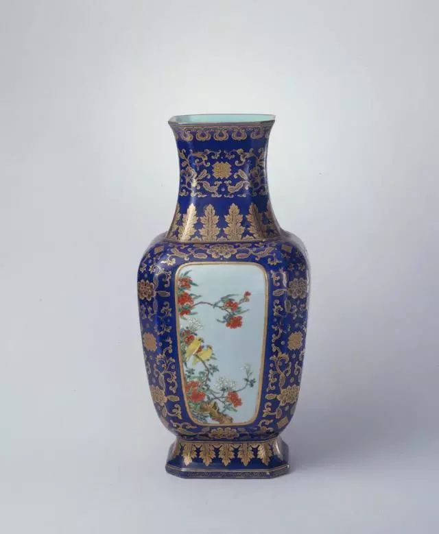 清乾隆霁蓝釉描金地开光粉彩花鸟纹方瓶 - 北京故宫博物院馆藏