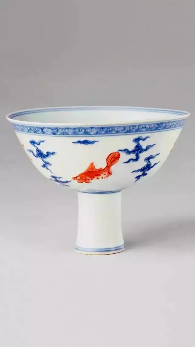 [明·弘治] 青花红彩五鱼纹高足碗矾