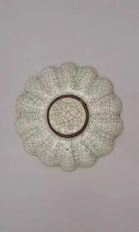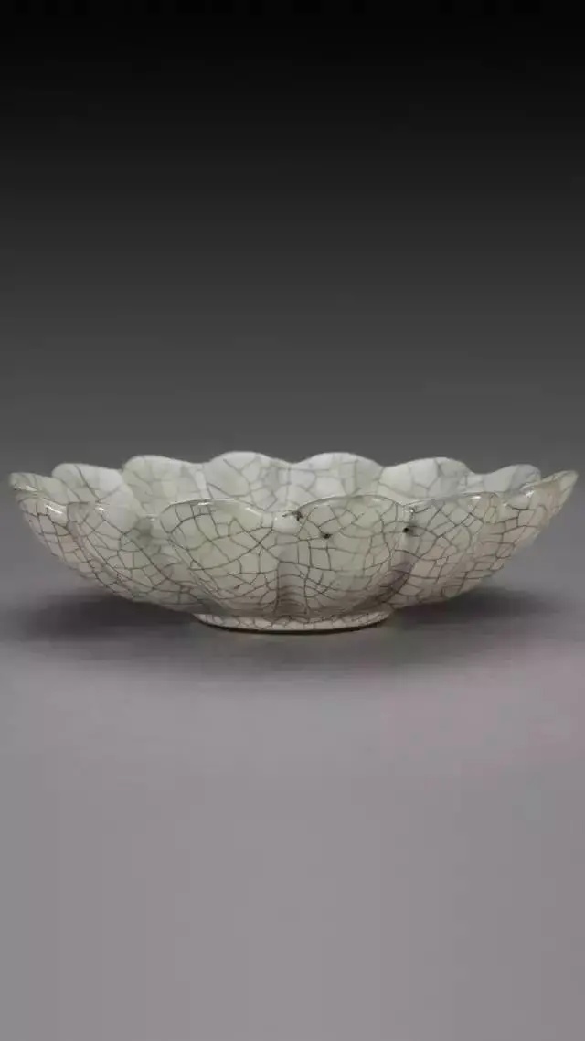 中国古代艺术家和陶瓷工匠在设计陶瓷造型时,善于从大自然动、植物中获得灵感,蛙形、虎形、 葵花形、菊花形等造型屡见不鲜。这件菊瓣式盘造型规整,灰青色釉素裹,交织如网的开片纹妙趣天成,堪称古陶瓷模仿花朵造型的典范。清宫旧藏传世哥窑灰青釉菊花式盘有两件,除此件以外,另一件现暂存于台北故宫。
