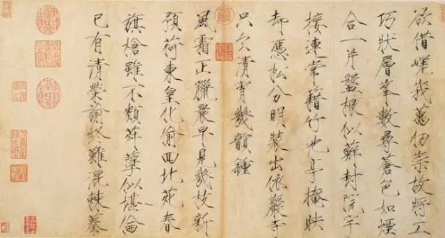 宋徽宗《秾芳诗帖》大字楷书,每行二字,共20行。这是赵佶瘦金体的代表之作。清代陈邦彦曾跋赵佶瘦金书《秾芳诗帖》:“此卷以画法作书,脱去笔墨畦径,行间如幽兰丛竹,泠泠作风雨声。”既是对这一诗帖的评赞,也是对“瘦金书”的艺术效果的很好概括。