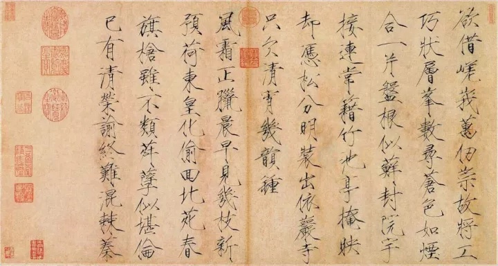 这幅诗帖,就是展现了宋徽宗“瘦金书”神采的精品之一。帖上的每一个字都细瘦、挺拔,笔划舒展、遒丽。在转折处,都明显可见书家刻意将藏锋、露锋、运转提顿的痕迹保留下来,形成横画收笔带钩,竖画收笔带点,撇似匕首,捺如切刀,竖钩细长而内敛,连笔似飞而乾脆等特点,通幅极具精神。这幅诗帖是由两首七言与五言律诗合并而成,也名为“欲借、风霜”二诗帖。