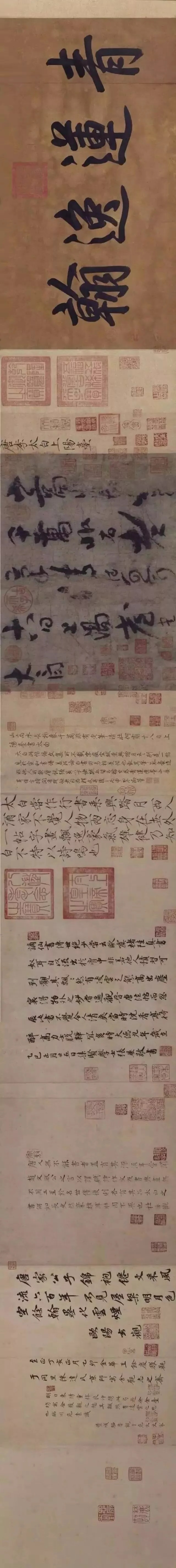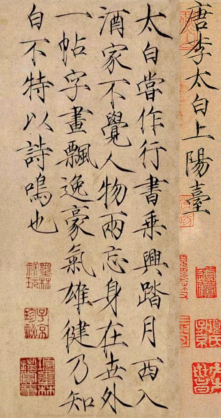 《上阳台帖》是李白传世的唯一书迹,历来收藏于内府,正文右上宋徽宗赵佶题签:“ 唐李太白上陽臺”一行。后纸有宋徽宗赵佶题跋。皆为瘦金书,极其工整秀雅,可见徽宗对李白书迹之膜拜。跋文为:“太白尝作行书 ' 乘兴踏月,西入酒家,可觉人物两望,身在世外 ' 一帖,字画飘逸,豪气雄健,乃知白不特以诗鸣也。”