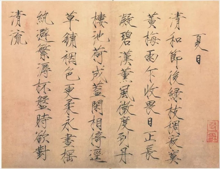 ▲宋徽宗《夏日诗帖》,楷书,纸本,后期风格,北京故宫博物院藏。