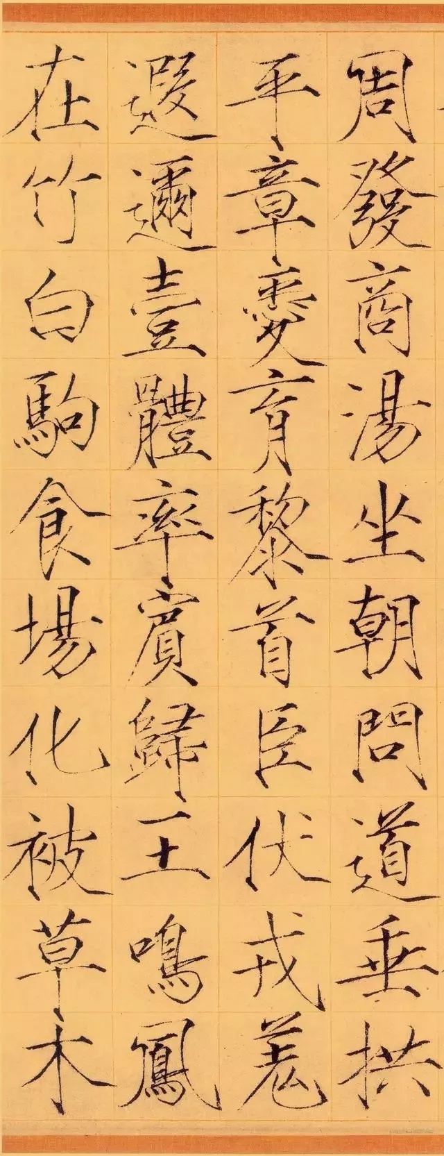 宋徽宗赵佶瘦金体书法千字文卷,为赵佶于崇宁三年二十二岁时书赐童贯的。其字大寸许,每行十字,前後百行。他真书学唐代薛曜,并且青出于蓝,间架开阔,笔划劲利,清逸润朗,别具一格。将“瘦金体”书法艺术推向极致。诚如当代著名书画鉴定家杨仁恺先生所云:“其结体疏朗端正,下笔尖而重,行笔细而劲,撇捺出笔锋而利,横坚收笔顿而钧,整体道丽瘦硬。”