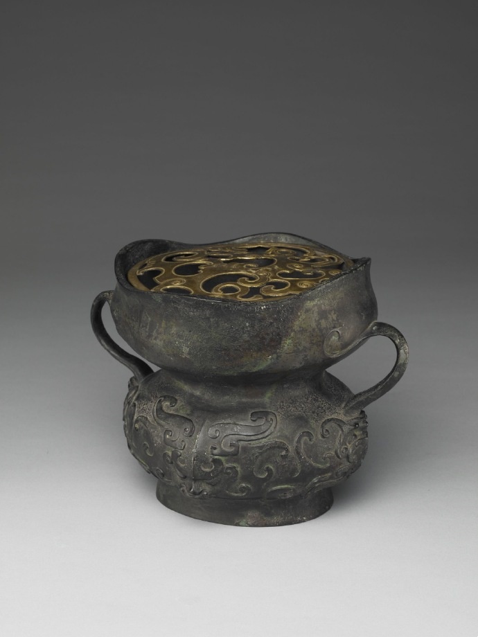 器分上下两层,上层的花口,和连接上下的把手,同样造型柔婉。下层的兽面作浅浮雕,纹饰线条俐落,兽眼炯炯有神,运用古青铜装饰母题,却别具新意。内装一筒型,筒上有镂空镀金云龙纹,可供取暖之用。