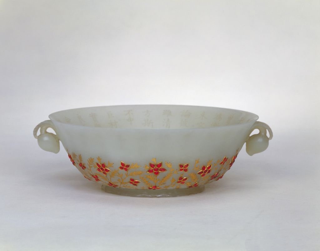碗玉质莹白。器壁薄,横截面为圆形,由口及腹斜收,桃形双耳,花瓣式圈足。腹外壁饰花叶纹,独具特色的是枝叶由金片嵌饰而成,花朵则以108颗精琢的红宝石组成。腹内壁有阴文楷书乾隆帝御制诗一首,全文为: