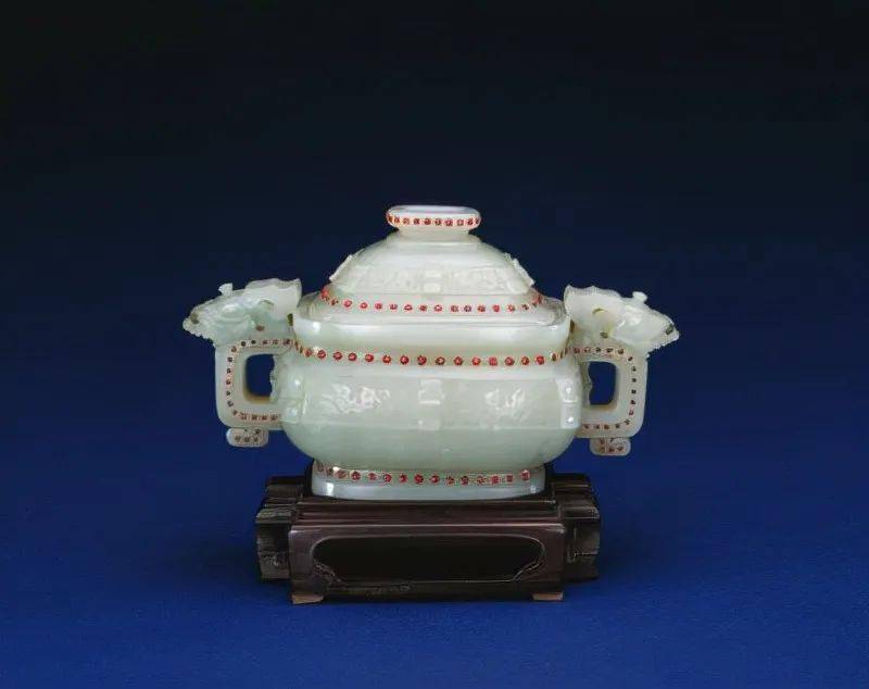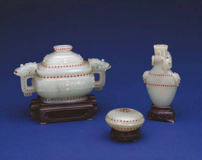故宫博物院收藏的“三式”质地很多,而在青玉上嵌红宝石唯此一套。在青白色的玉石上镶嵌着颗颗鲜红色的宝石,尽显华丽与富贵。