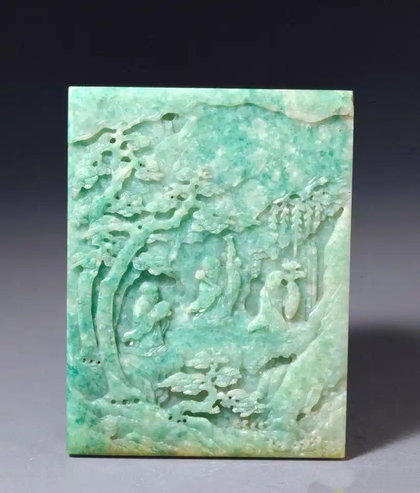 翠雕人物山景山子,清,高16.1厘米,长24.7厘米,宽10.5厘米。