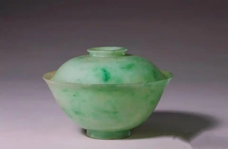 制作这样一个翠玉盖碗需要使用很大的一块翠料。此碗所用料绿白相间,色泽鲜艳。器壁很遣,并带有优美的弧度,做工精致,当出自治玉高手