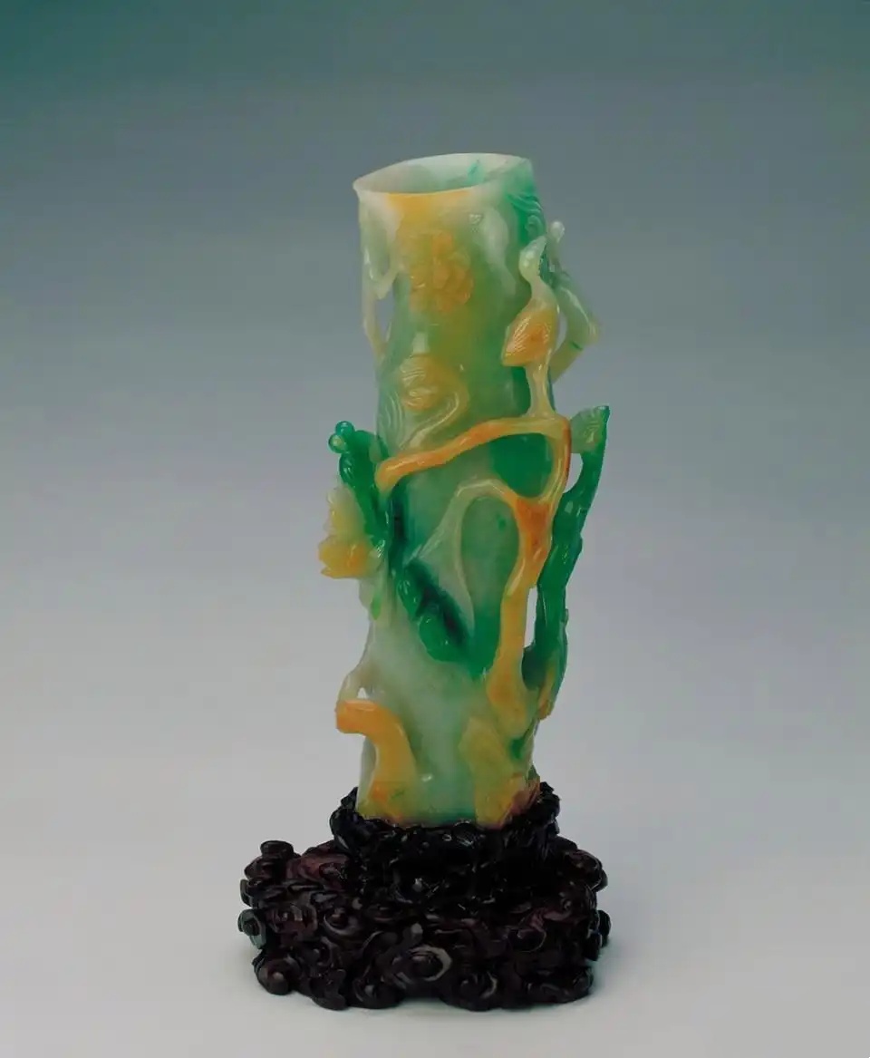 花插属陈设用品,内可插物。明代玉器中已有花插,多呈筒状。清代的玉花插样式较多,其中树桩形花插较为典型。这件花插所用翠料有较高的透明度,局部绿色深重,属高档材料,是清代宫廷的重要陈设器