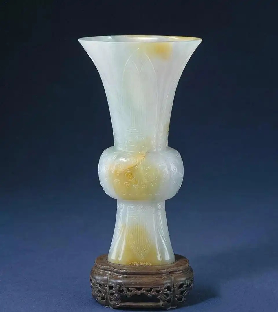 翠色青绿,有翠料表皮的风化色皮色。翠觚海棠花瓣式口,喇叭形颈,足外撇。颈及足饰蕉叶纹,腹部饰凸起的兽面纹。底有篆书“乾隆年制”款。