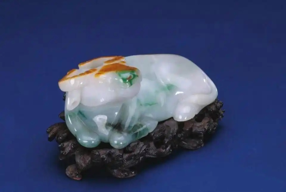 卧牛翠质,微透明,头、角及身体的一侧留有深黄色玉皮,黄绿相衬,色泽极美。牛呈卧伏状,四肢均屈于腹下,尾则搭于一足旁。下配以海水纹紫檀红木座。此作品虽然素身而不琢纹饰,但牛之身体肌理明显,神态刻画生动。