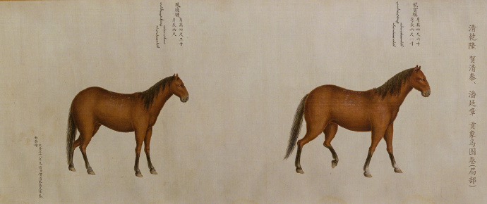 清乾隆,贺清泰、潘廷章,贡象马图卷。乾隆帝执政期间,清朝国力达到鼎盛,许多周边部族归顺并向清朝进贡。廓尔喀(位于今尼泊尔境内)就是其中之一。廓尔喀地处中国西藏的西南。历史上,廓尔喀兵曾多次侵入中国,后被清政府降服。为了改善与清朝的关系,廓尔喀开始向清朝皇室进贡当地的特产,其中包括马和象等珍贵动物。乾隆五十八年(1793)冬月,乾隆帝谕令贺清泰和潘廷章将廓尔喀进贡入宫的马和象画下来。其中来自法国的贺清泰负责画马,来自意大利的潘廷章负责画象。贡马分别叫“紫云騱”和“凤臆騪”, 它们耐寒耐粗饲,具有较强的耐力和负重能力,适于驮运、农业劳作及山地交通。