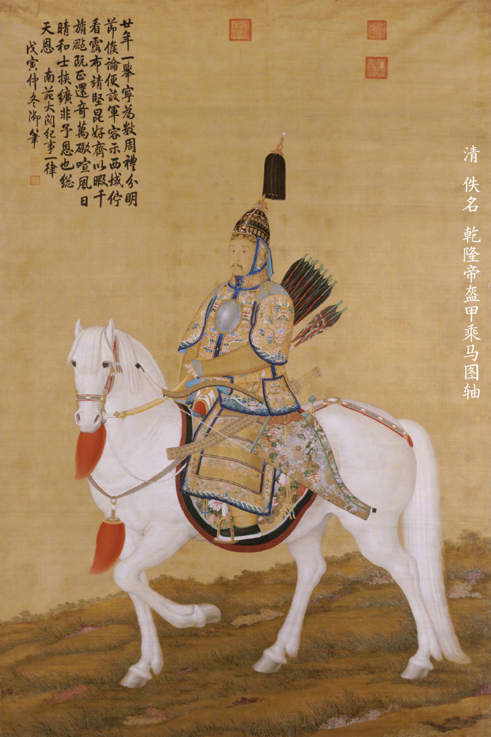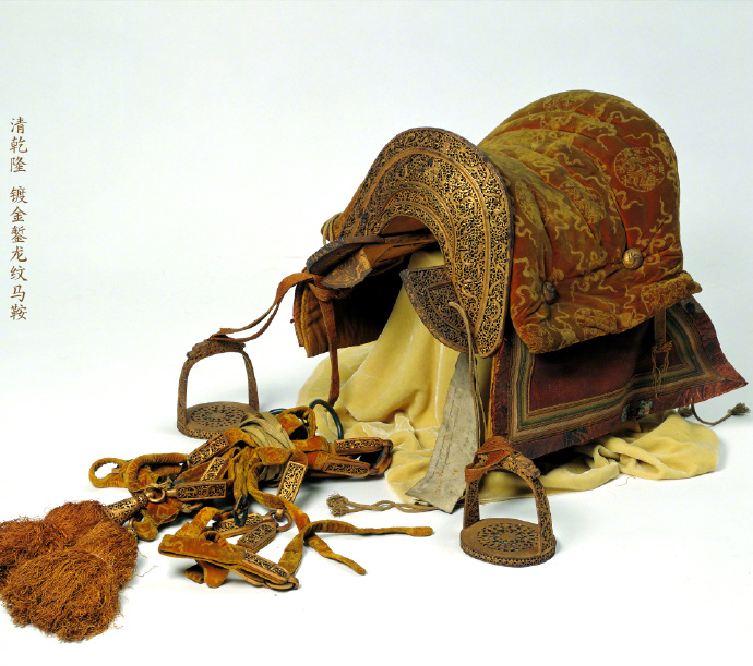 清,佚名,乾隆帝盔甲乘马图轴;清乾隆,镀金錾龙纹马鞍。乾隆帝自始至终秉持“骑射乃满洲立国之根本”的理念。基于此,他通过举办南苑阅兵、木兰秋狝、南海冰嬉等一系列活动,激励八旗将士保持强劲的战斗力。图为乾隆二十三年(1758),乾隆帝亲临南苑检阅八旗军的画像。画面中,乾隆帝身着戎装,端坐于马背之上,缓缓前行。其胯下御马头型小巧、额部狭窄,双耳如削竹般挺立,双目炯炯有神。皮毛雪白无瑕,犹如锦缎般泛起层层波光。强健的肌肉线条饱满而富有张力,蕴含着强大的爆发力。俗话说“好马配好鞍”,乾隆帝御用的马鞍极为考究,装饰华贵典雅。右图中的马鞍以镀金錾龙纹的精湛细腻工艺制成,充分展现了当时宫廷造办处匠人们高超的技艺水平,已然达到了实用性与艺术性完美融合的境界。