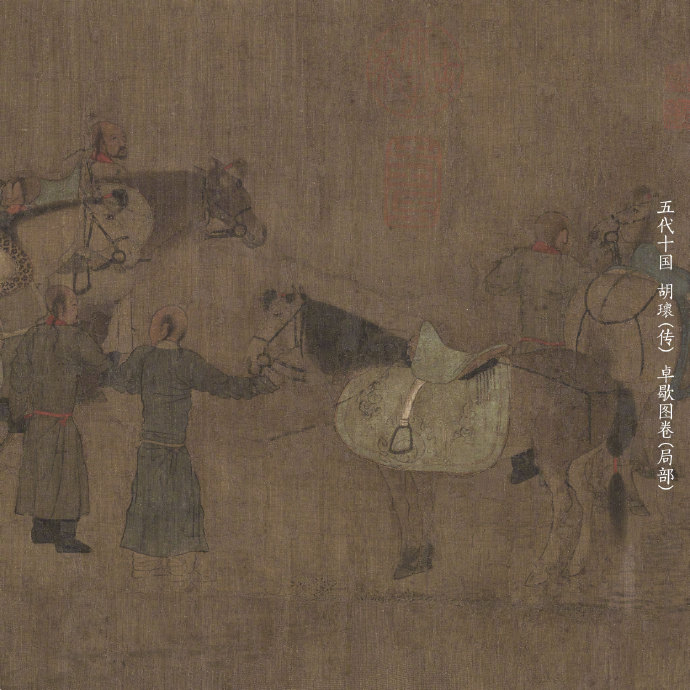 “卓歇”即为停车立帐、休整小憩之意。这幅画作旧传为五代契丹画家胡瓌所绘,据画中人物的外形特点,极可能出自金代汉族画家的手笔。画卷中表现的,是女真贵族在狩猎歇息时,邀南宋使臣宴饮观舞的情景。马背上的猎物,点出人与马刚从追逐喧闹中转入静态;马群的尽头,是走向乐舞场地的捧花女;舞蹈者在箜篌的伴奏下跳跃,构成全图的高潮。