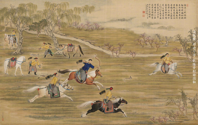 清乾隆,郎世宁等, 乾隆帝射猎图轴。图绘乾隆帝及王公、侍从在南苑捕射野兔的瞬间。作者通过对骏马上精悍的人物与狂奔逃命野兔的传神刻画,成功地展示出乾隆帝尚武骑射的创作主题。从图上乾隆帝所书御制诗可知,他此次南苑射兔可谓是收获满满,“是日凡中八兔”。其骄人战绩的背后,离不开他娴熟的骑射技法,也离不开他胯下快马的飞奔之功,此马四蹄生风快如霞,奔跑速度疾如雷电。