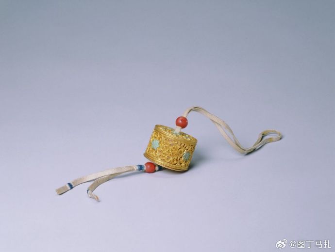 金镂空嵌松石扳指盒,清,高2.6厘米,径3厘米。 扳指盒圆柱状,天盖地式。盒上錾刻镂空缠枝花,花芯嵌绿松石。有黄丝带纵向穿过盒中心,两端各系红色珊瑚珠一粒。