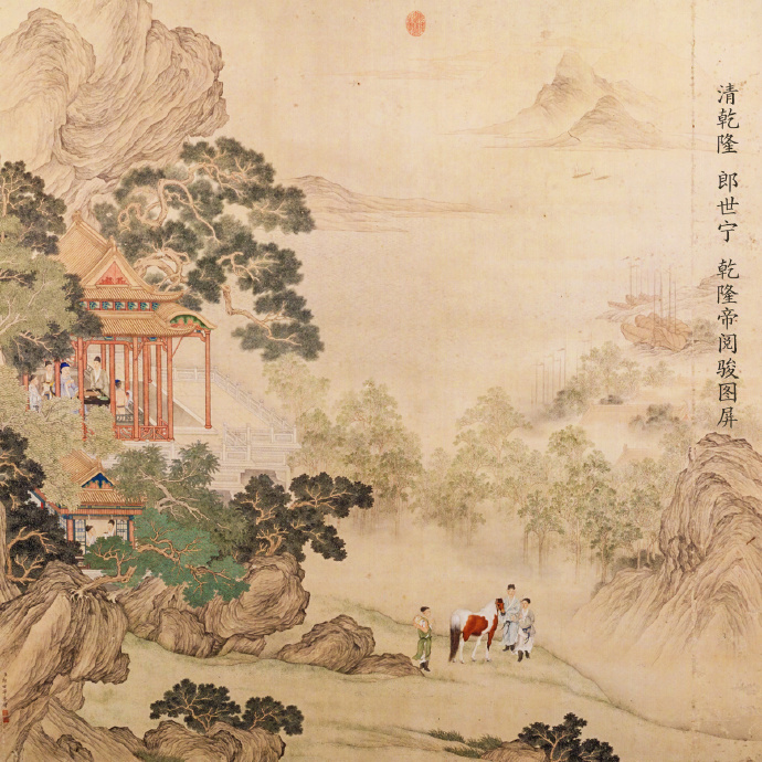 图绘年约40岁的乾隆皇帝,一身休闲的高士装扮,在雕梁画栋的游亭内,品茶赏马的景致。马,是乾隆皇帝重要的交通工具之一,他每每出宫巡视各地或秋称狩猎均要带上良驹快马以备随时骑用。于是各地尤其是游牧民族地区旦有良种马,纷纷敬献宫廷,以邀恩宠。乾隆皇帝对献上来的马非常重视,不仅对它们精心驯养,而且还令宫廷画家将它们画下来,以作永久的纪念。
