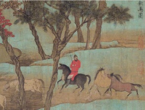 元,赵孟頫,秋郊饮马图卷。此图卷堪称赵孟頫的代表作。画面描绘了秋初时节郊外的景象,牧马人骑在马上,手持马鞭,正督促着马儿到池畔饮水。画面中的马均未配鞍座,它们各个肌肉发达、线条流畅,四肢修长而蹄子宽阔。这些马儿姿态各异,有的相互追逐打闹,活力四射 ;有的则悠然自得地缓步前行,尽显闲适 ;还有的俯首饮水,将无拘无束的自然天趣展现得淋漓尽致。牧马人身着红色衣袍,从其装扮和姿态推测,应该是位管理官府马匹的圉官。本图卷曾被清乾隆帝珍藏,他在引首处题“清泉坰牧”四字,以此赞美景致宜人的牧放环境。