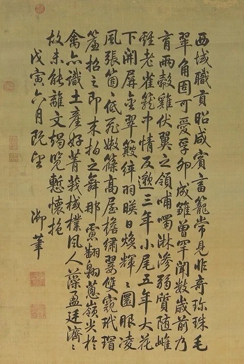 乾隆二十三年(1758年)六月,西域哈密进贡孔雀,乾隆皇帝作有《孔雀开屏》御制诗并书于画上。同年七月十二日《活计档·如意馆》记录:“著郎世宁画开屏孔雀大画一轴,补景著方棕、金廷合笔,用白绢。”乾隆皇帝对此画创作指示非常具体,此画也为中西“合笔画”的上乘之作。