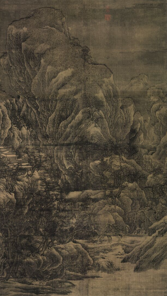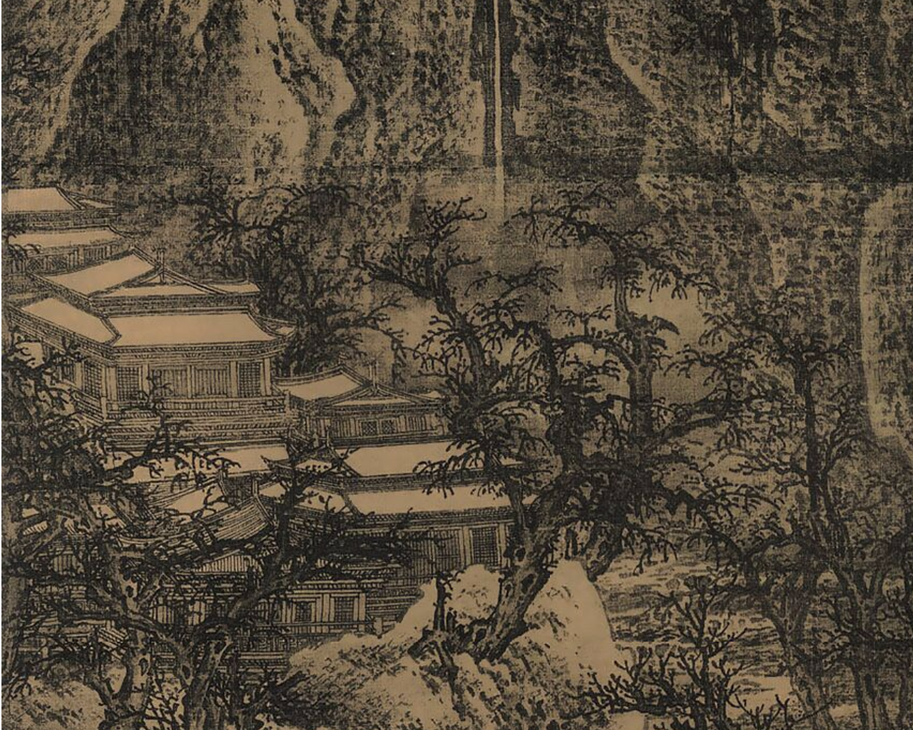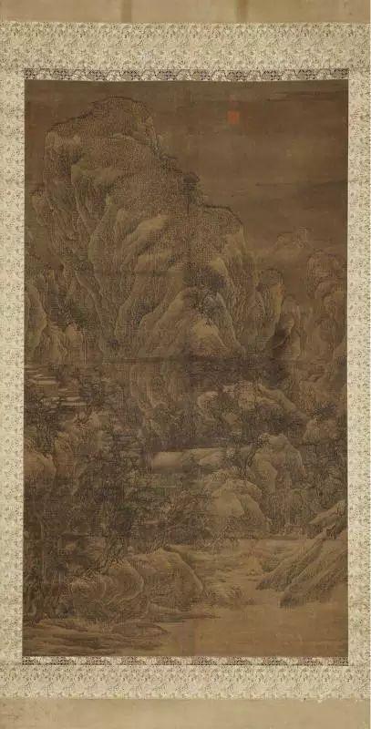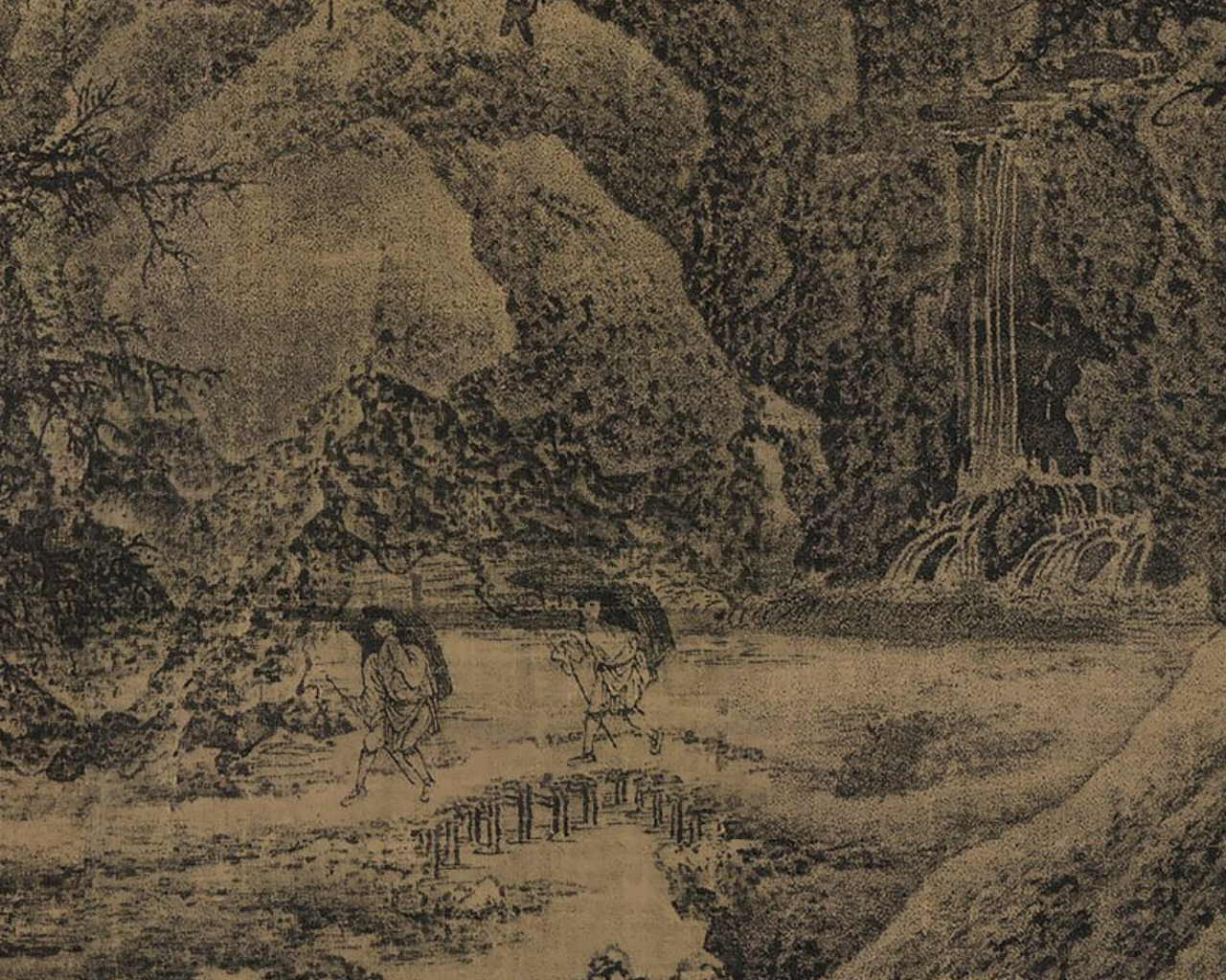 此画与《溪山行旅图》中的商旅有异曲同工之妙,左下渔夫卖鱼,山间小路上的行人冒匆匆赶路,山腰间楼阁殿宇隐现。此画皴法多是雨点皴,画中景抽绘树木,用笔遒劲,姿态各异,为画面平添生气。近处的柏树,笔法极其精彩。主峰作寒林密布,如茸似毯,密而不乱。是一幅非常优秀的宋代精品。