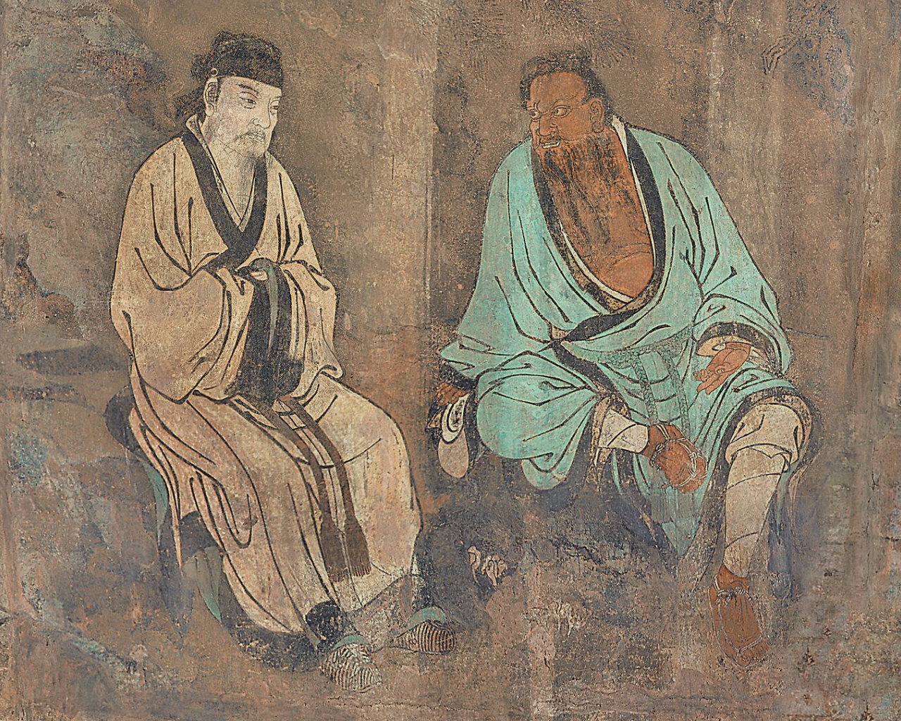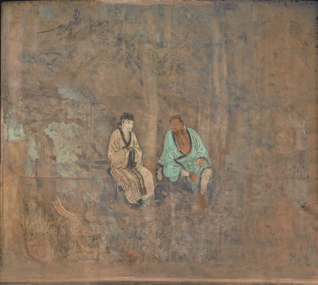 画面上,钟离权和吕洞宾对坐在石头上,身后有枯藤缠绕的老松。钟离权袒胸露腹,目光注视着吕洞宾,渴望听到对方的回答。左手伸出二指,告诉吕洞宾面前有两条道路可以选择。吕洞宾则拱手危坐,静听老师的教导,目光凝视,俯首沉思,整幅壁画笔法挺健,气韵生动。
