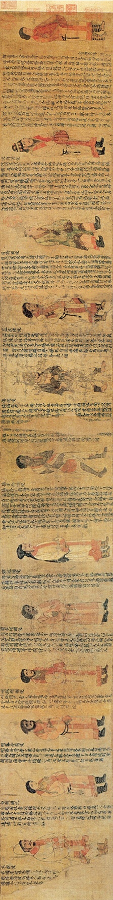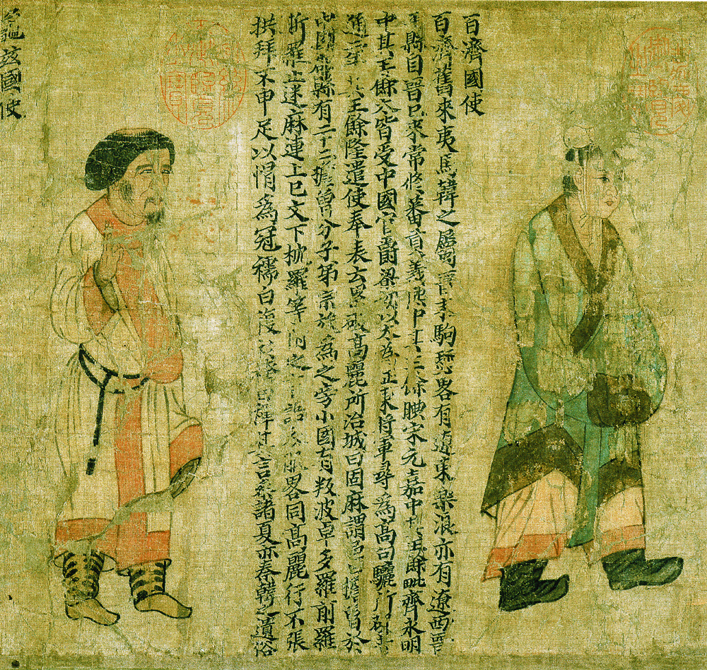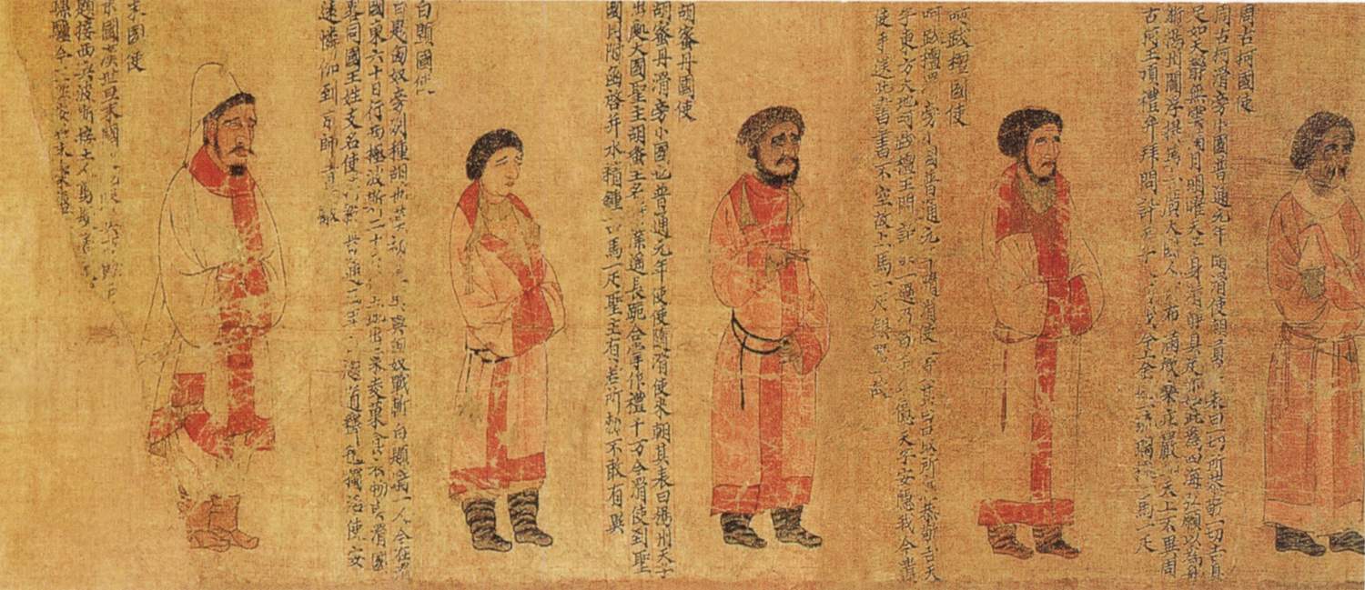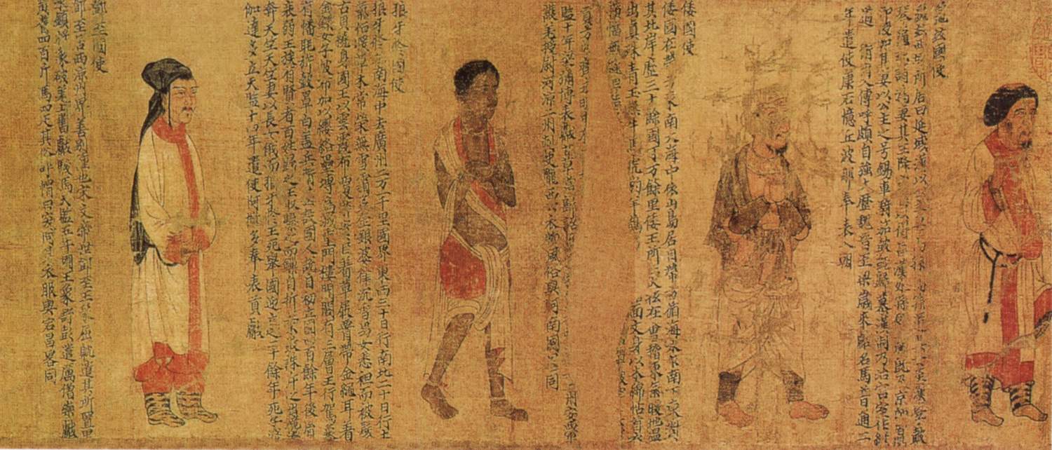 此图又名《番客入朝图》或《王会图》,展现南北朝时期国家间友好往来的繁盛场面。现存此图为残卷,描绘十二位使者朝贡时的形象,依次为滑国、波斯、百济、龟兹、倭国、狼牙修 邓至、周古柯、呵跋檀、胡密丹、自题、末国的使者。画中人物线条简练遒劲,以高古游丝描为主,间施兰叶描手法。人物形象承袭着魏晋以来富有装饰而谨严的风格,但略欠生动。