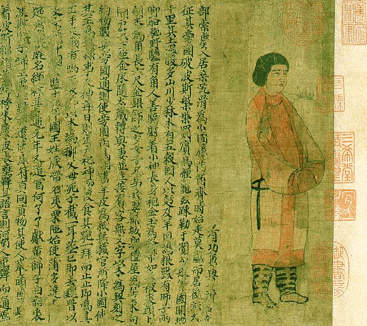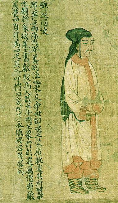 萧绎(508年 - 554年),南兰陵(今江苏武进)人。南朝梁画家,即梁元帝。字世诚,小名七符。武帝萧衍第七子。生眇一目,既长好学,博涉技术。初封湘东王,承圣元年(552)即帝位,魏将于谨陷江陵,绎出降被杀。绎技巧是多方面的,善绘佛面、鹿鹤及景物写生,以及善画外国人物形象。尝画《圣僧像》,萧衍为之题识。又画《宣尼像》,并自书赞。时人谓之“三绝”。出任荆州刺史时绘《蕃客入朝图》,描写25国使者不同的相貌与服饰。唐代张彦远疑《职贡图》即是《蕃客入朝图》。《职贡图》卷,南朝,纵25厘米、横198厘米,现藏中国历史博物馆。现所见《职贡图》卷为北宋熙宁年间的摹本。图卷原画描绘南朝梁代外国使者25人朝贡的形象。现已残损,仅存12人,皆左向侧身,身后楷书榜题,疏注国名及其山川、风俗、历史及历代交往情况、纳贡物品等。列国使者自右至左为:滑国、波斯、百济、龟兹、倭国、狼牙修、邓至、周古柯、呵跋檀、胡密丹、白题和末国等。一些美术家认为,宋人此卷即据萧绎的《职贡图》摹绘。(据《古观录》卷十一、《石渠宝笈初编》21卷三十二记载。)此卷当时尚存25国使,图后有赞一则,并有宋熙宁年间苏颂题记,元康里巎巎和王余庆题跋。此卷清初为梁清标收藏,后入清宫,曾被溥仪携至东北,流散残损,凡其它十三国使及卷后题记赞跋俱佚。