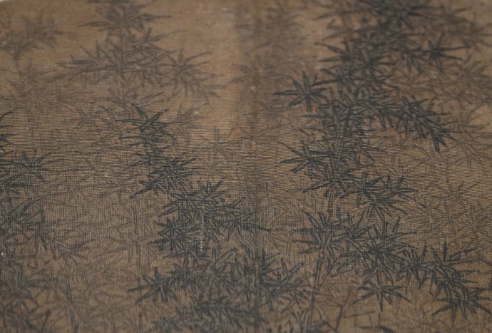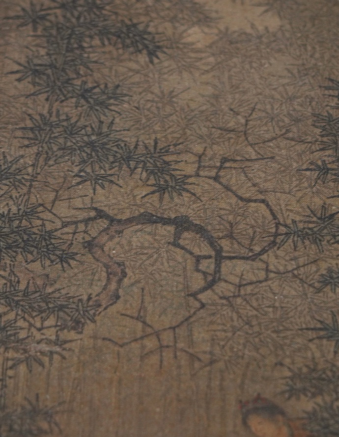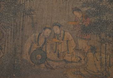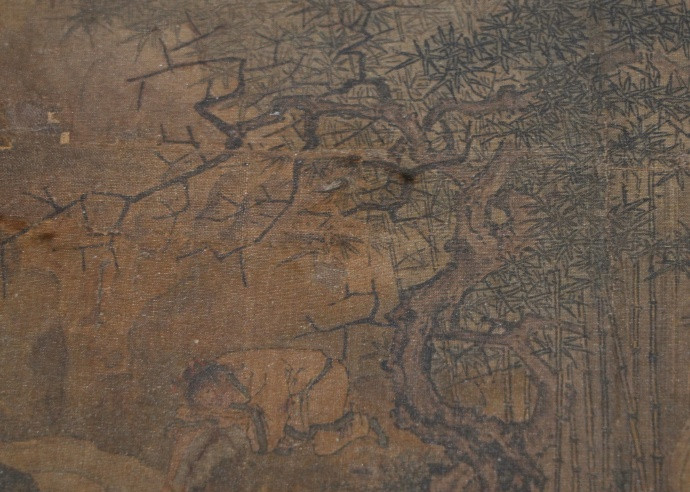 此图绘溪边竹林下,三位文士,身着长袍,对坐于兽皮垫上。姿态各异,或拨阮,或凝听。旁有一童子侍候,一童子跪伏溪边汲水。图中人物生动传神,衣纹细劲流畅。衬景丛竹老树,疏密、远近、浓淡相间,错落有致。全幅构图丰满而不拥塞,应为南宋绘画中的佳作。