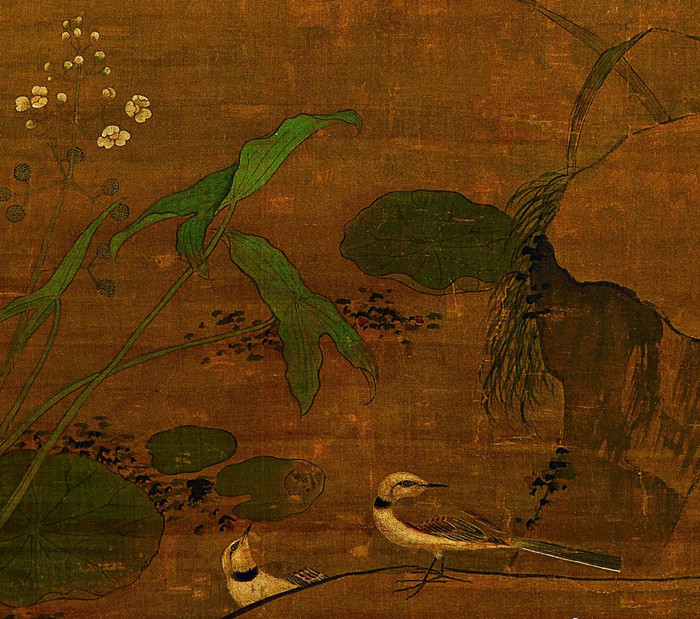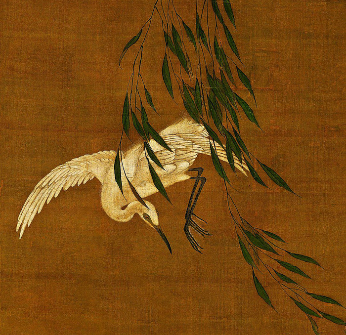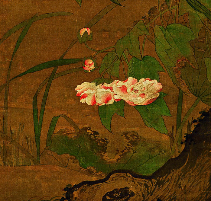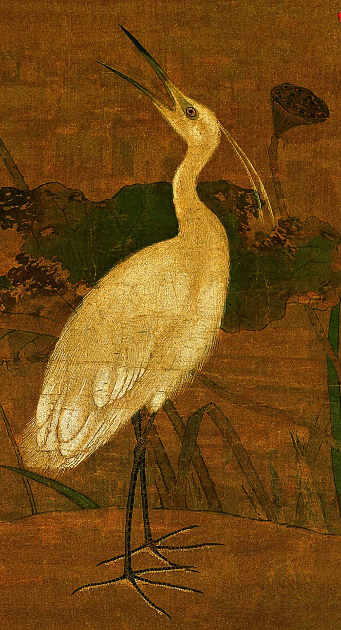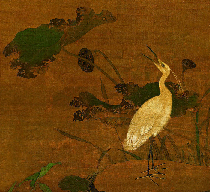 此画表现是秋天野外荷塘一隅之景。画幅下端一片荷塘,长有几簇菖蒲,茎叶舒展,有的茎叶弯斜,相互交错在一起。荷塘里荷花已凋谢,老叶离披,荷茎弯曲,而叶下垂如擎盖。较大的莲蓬低垂,较轻小的莲蓬仍挺立向上,荷叶已衰败,荷塘里的水草也有泛黄,还有茹菇和其他花草,相植其间。正逢天高气爽时节,荷塘边一丛木芙蓉,袅袅而立,花枝向外伸展,舒枝展叶,枝头缀满花朵,有的盛开,有的含苞待放,煞是可爱。画幅右侧一高大柳树横斜出画面,枝干挺拔,柳枝垂挂,柳叶袅袅迎风飘拂。画幅的中心有白鹭二尾,一只白鹭伫立在荷塘里,侧身昂首呜叫,另二只在柳树旁盘翱,与伫立的白鹭遥相呼应。二只白鹭姿态各不相同,形态优美,无论飞翔还是站立都十动自然逼真传神,目似点漆,颇具精神。
