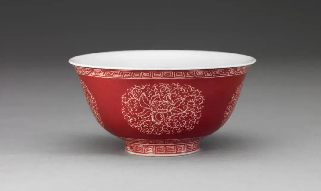 清 乾隆 珐琅彩洋红地剔花团花碗