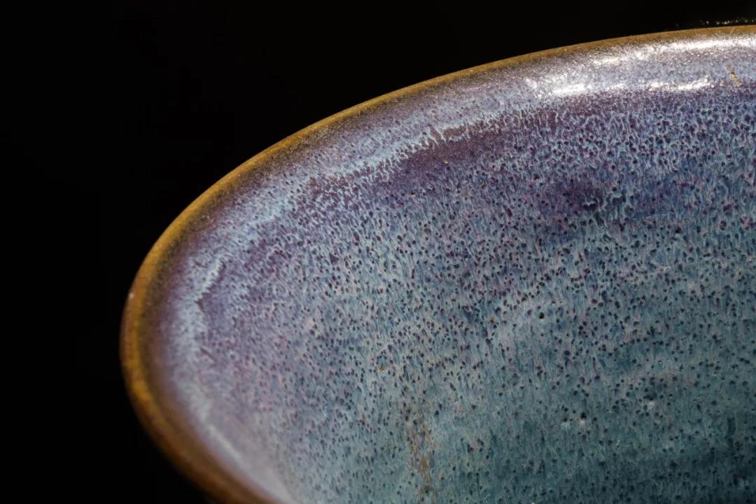 蚯蚓走泥纹是钧釉的特征之一,这种现象是由于釉层在干燥时或烧成初期发生干裂,后在高温阶段又被粘度较低部分流入空隙填补裂罅所产生的。钧釉的釉层很厚,瓷胎在上釉前先经素烧,因而促使裂纹和缩釉等现象出现。然而,蚯蚓走泥纹的出现给钧瓷平添了一种自然的美感。