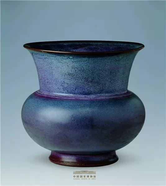 这只花盆形似渣斗,圈足外撇,釉色紫蓝,上浅下深,身上有与色地不同的呈不规则流动状的细线,俗称“蚯蚓走泥纹”。