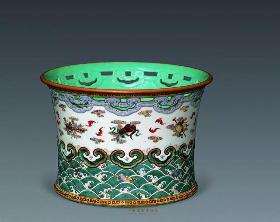 镂空又称为“镂雕”,是瓷器传统装饰技法之一。此器造型别致,将彩绘、镂空装饰技法相结合,构图巧妙,工艺精湛,为乾隆粉彩器中罕见的艺术珍品。