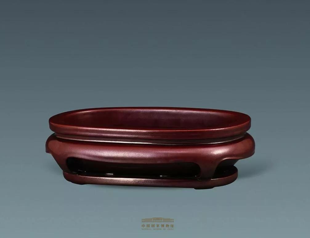 这只花盆口呈海棠式,晶莹的天蓝釉色中映现出宛若玫瑰般的紫红,极其斑斓。外底刻“重华宫”、“金昭玉翠用”等楷书题字,为清宫旧藏。