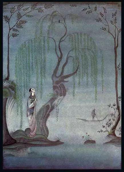 丹麦人最会讲故事,也最会画插画。丹麦插图画家凯·尼尔森(Kay Rasmus Nielsen)是20世纪席卷世界的“插图黄金时代 ”的关键艺术家。1924年,他出版了《安徒生童话绘本》,《夜莺》的故事也在其中。神秘古老又富饶的东方王朝吸引着安徒生也吸引着尼尔森。在尼尔森的插画中,他引用中国古代画中“以形写神”的特点,赋予画面整体一种纤细荒凉的美感。当夜幕降临,真正的夜莺停驻于柳枝之上,美妙的歌声引得树下的女子和船夫都停下来仰头聆听,此时,万籁俱禁,只有夜莺的轻啼余音绕梁,响遏行云。