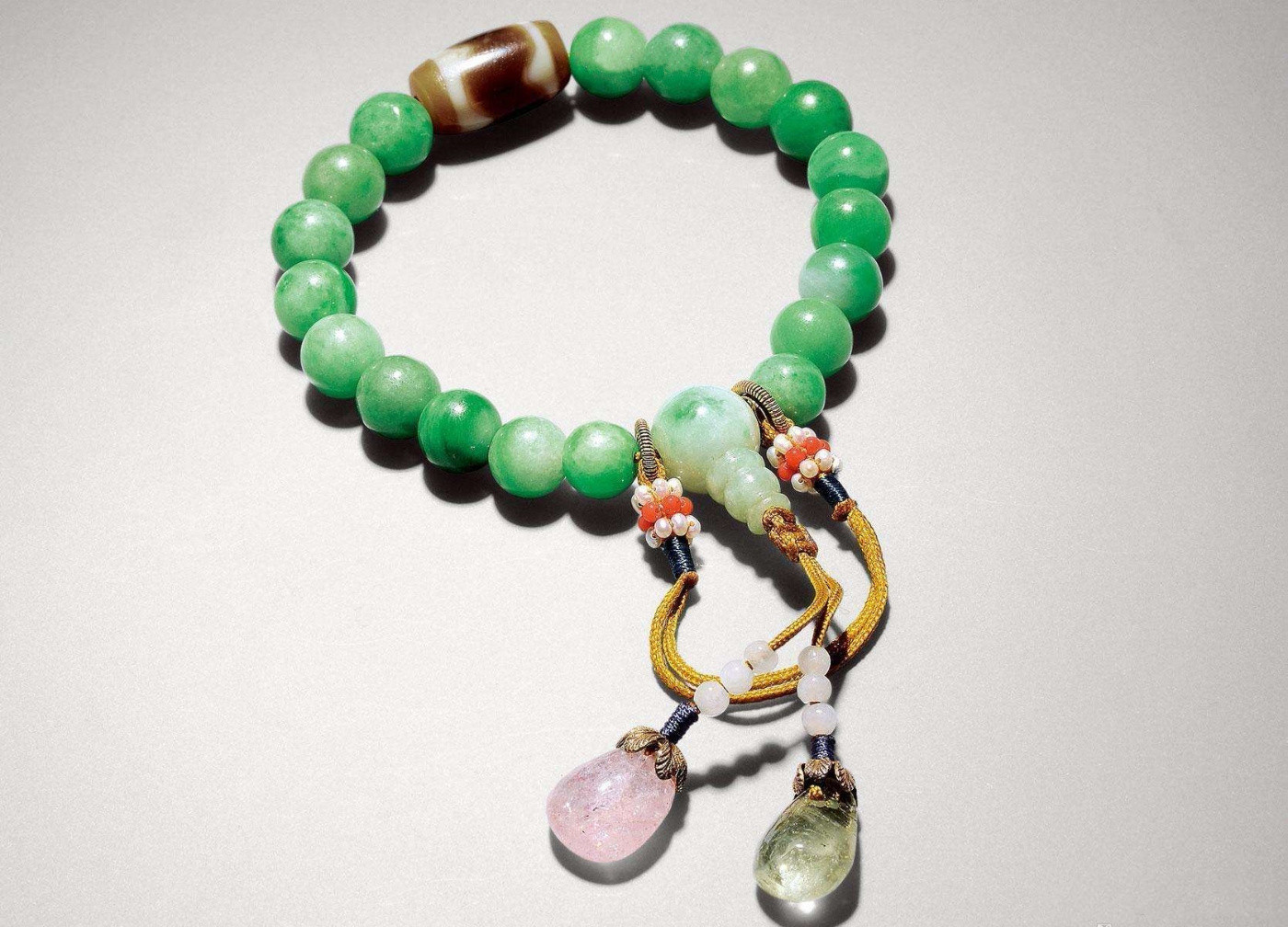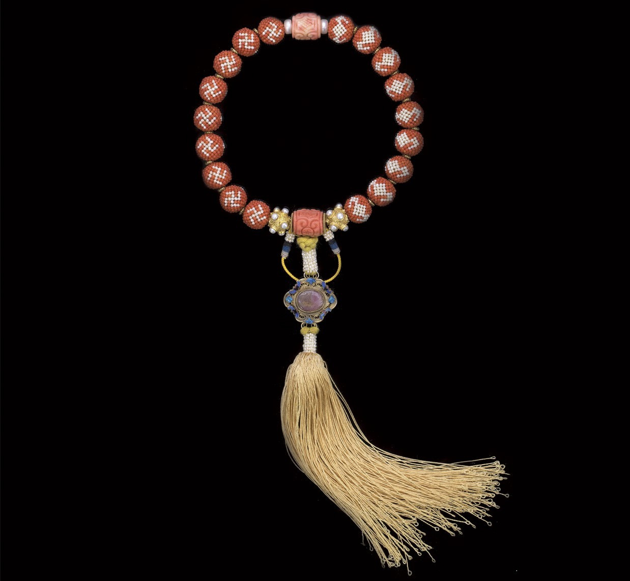 清宫手串选材多样,多以珊瑚、碧玺、翡翠、青金石、玛瑙、蜜蜡等为主,坠角用翡翠、珊瑚、珍珠、碧玺等装饰。