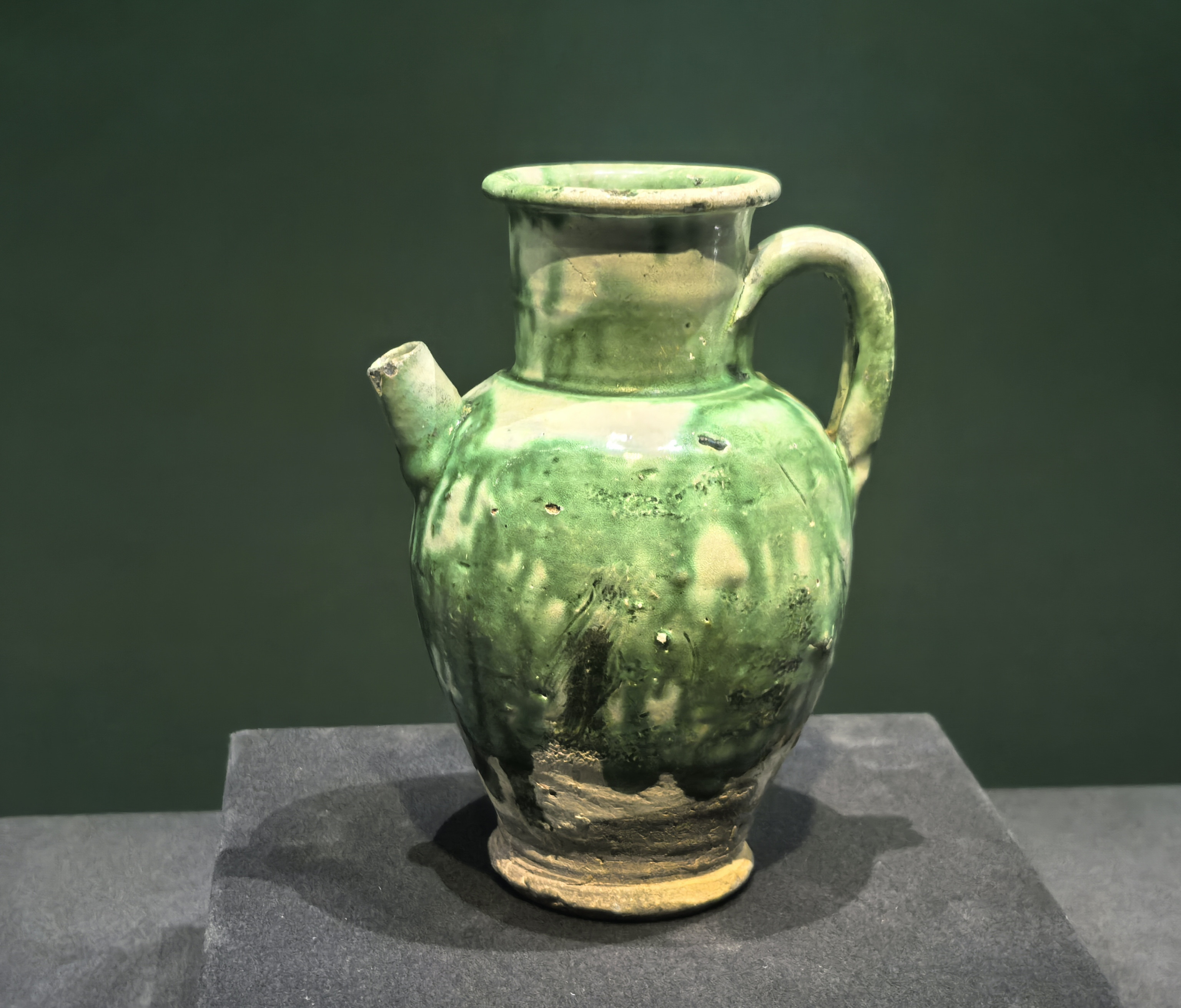 整体造型清秀挺拔,釉色莹润,绿彩鲜明。圆唇,高敞口,自口沿向下斜收,丰肩,圆鼓腹,下腹斜收至底,矮圈足,圈足外撇。肩部一侧接短管状流,另一侧接扁平状柄。通体施化妆土,外罩透明釉,肩部、腹部点染不规则的嫩绿色,如绿柳新荷。