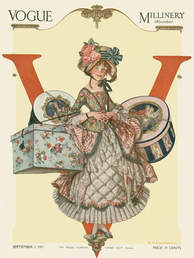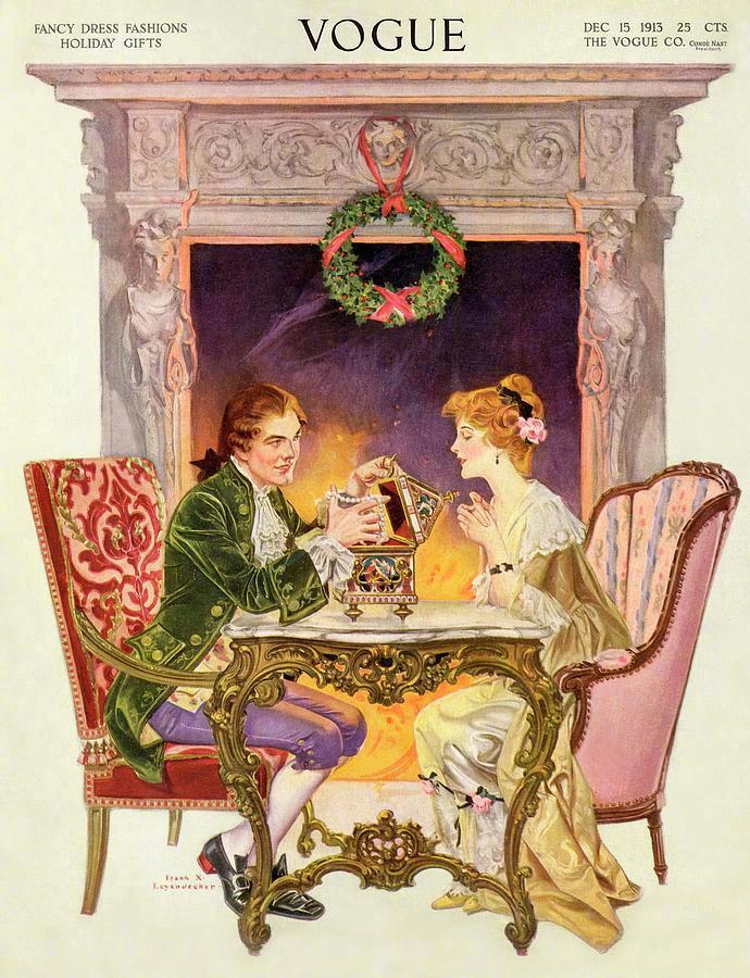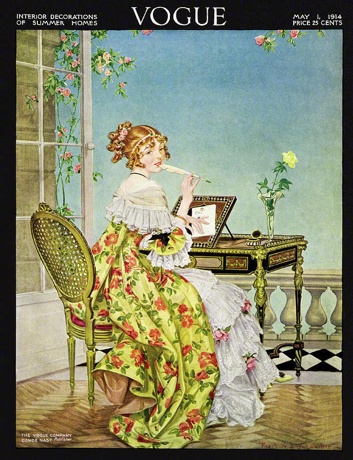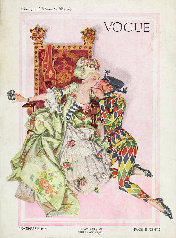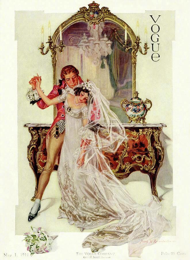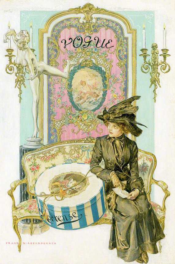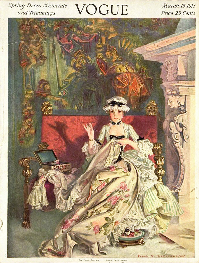 20世纪初Vogue杂志封面上盛装华服的18世纪淑女。作者:Frank X. Leyendecker