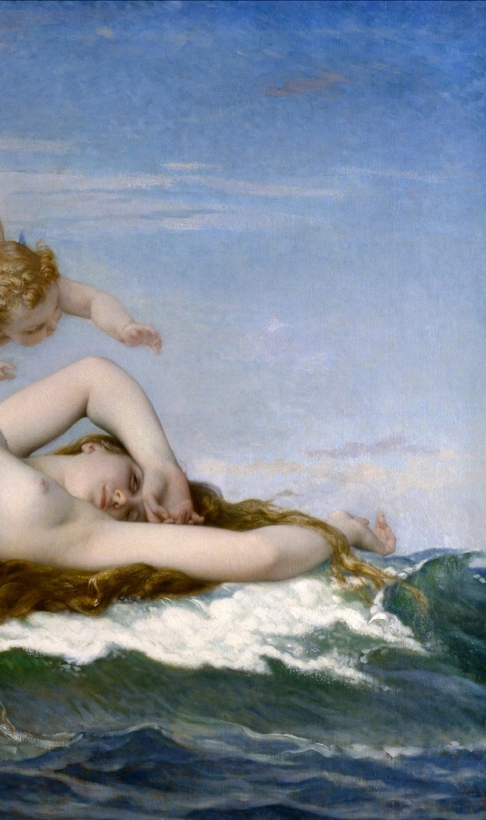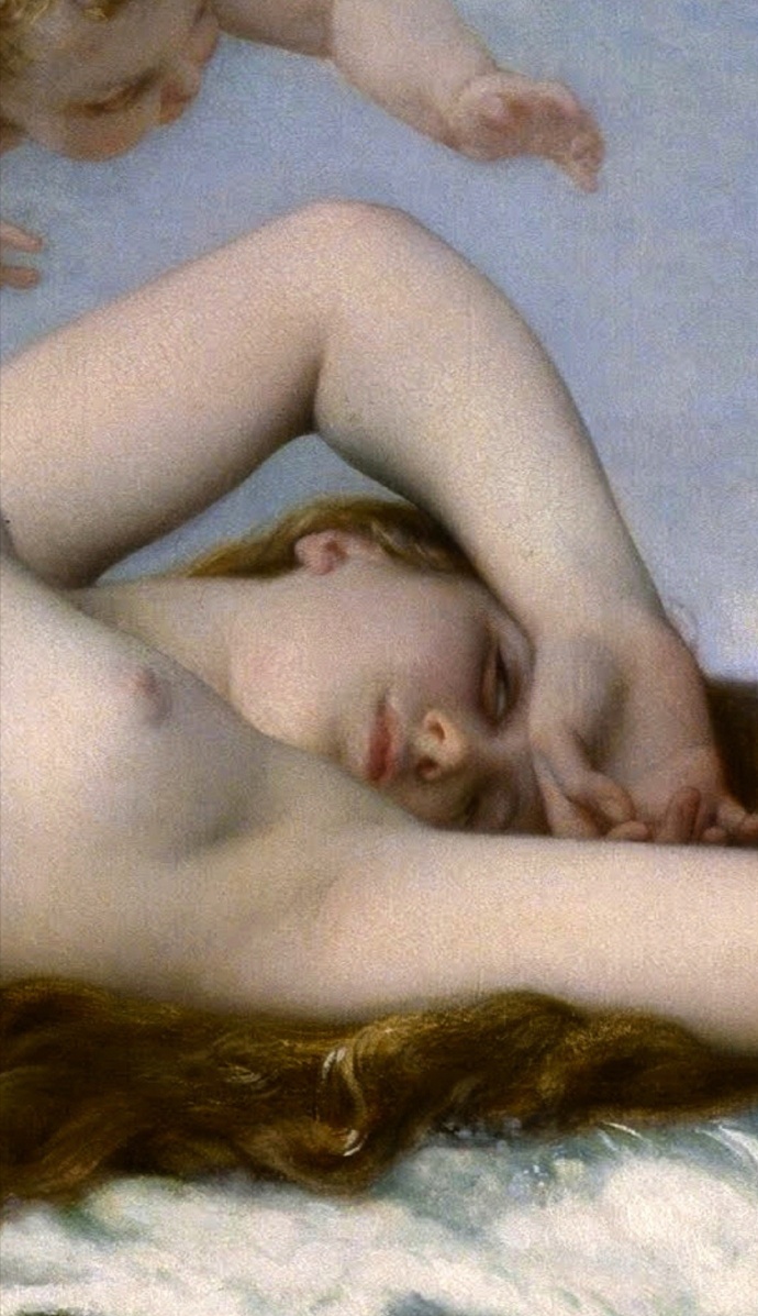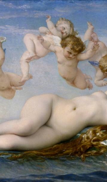 法国学院派(Academicism)画家亚历山大·卡巴内尔 (Alexandre Cabanel,1823 – 1889)的两版布面油画作品《维纳斯的诞生》(The Birth of Venus)及其细节。