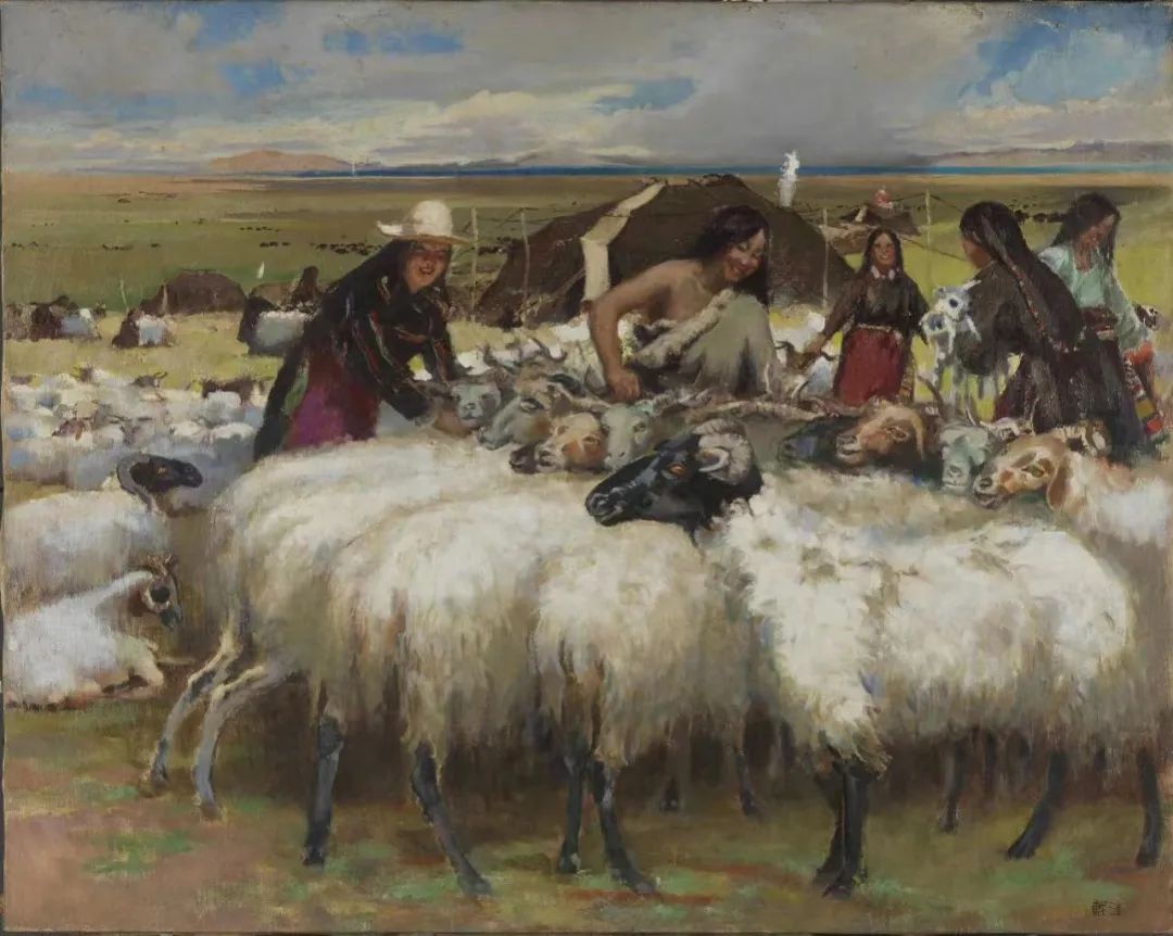 戴泽作为徐悲鸿弟子之一,始终遵循现实主义创作原则,以满腔热忱面向现实、歌咏自然。1963—1964年,戴泽与潘世勋共赴西藏写生,完成了一批西藏题材油画作品,《纳木湖畔》正是其中一幅重要作品。该幅作品描绘的是西藏牧民安居乐业的生活场景。画面丰富充盈,成群结队的羊群与居于中央的女性牧民融为一体,人物身上洋溢着的喜悦与欢愉,奠定了作品热烈、欢快的情感基调。画面远端,广袤无垠的高原草甸上,耀眼的阳光穿透云层洒向大地上劳作的人和他们的家园,投射出画家对平凡而充实的农牧生活和美好的大自然的向往。正如那冲破油画“酱油调”的明媚光线一样,神圣的西藏大地和那里质朴的人民自20世纪40年代起不断激发着艺术家们的创作灵感,启迪着中国油画民族化的新进程。戴泽《布达拉宫》(1963)、《拉萨春天》(1964)等同样诞生于此次西藏之行的写生作品,印证了当时以绘画表现时代历史与社会主义新生活的创作思路。《纳木湖畔》脱胎于写生,牧羊女的圆润面庞和真诚笑容不仅是藏族人民的真实写照,更是那个时代纯朴的劳动者们的集体缩影,是留驻在画家笔端的时代印痕。但是,作品完成时间与写生时间相隔近20年。社会文化的变革与生活的沉浮曲折,给予戴泽更多对人生和艺术的思考。他说:“相信你的眼睛,画你所看到的。”他又说:“我随着潮流来,随着潮流去,离开潮流是自讨苦吃,但是要顺服自然,心平气和。”这既是对现实主义创作态度的忠实践行,也是对艺术随时代演进的清醒认识,反映在创作中,则多了几番审视和观察。正如《纳木湖畔》最前方那只黑脸绵羊,它注视着画家方向,似在观察,又似在召唤。这何尝不是画家在20世纪80年代重提画笔后的真实情感:拿起多年前未完之作,回味过往,不知藏民们生活是否美好如故?这种画面内外的情感交流,正是80年代以来艺术家们着意强调的创作理念,作品也因此凝聚了更多艺术家的个人感受。在戴泽心中,这个答案无疑是肯定的,因为他向往美好、表现美好的心一直未曾改变。