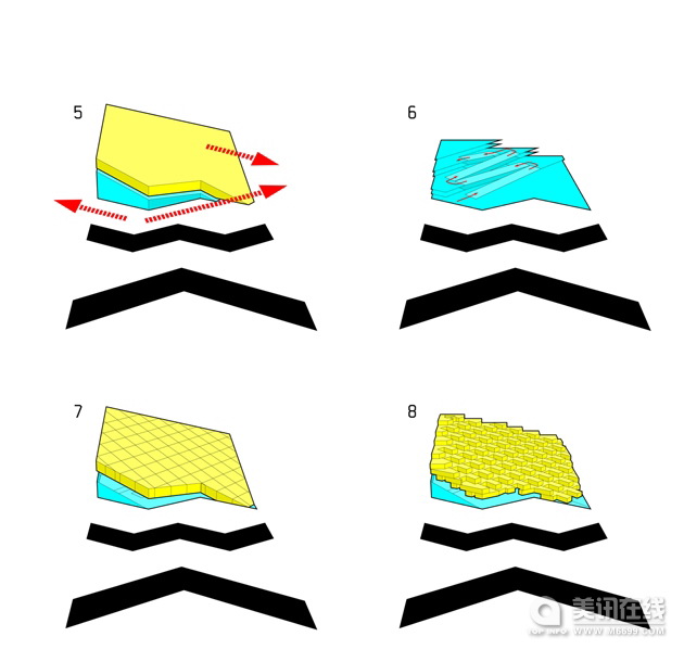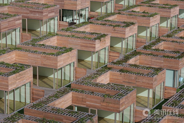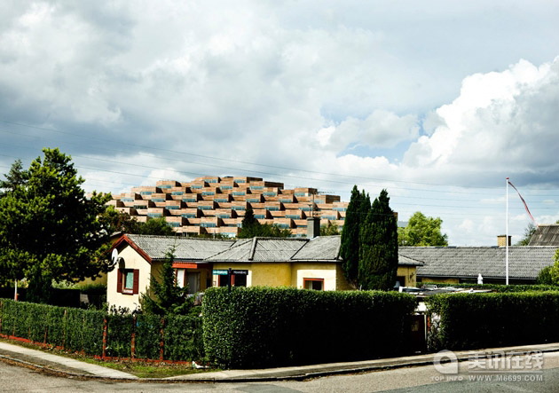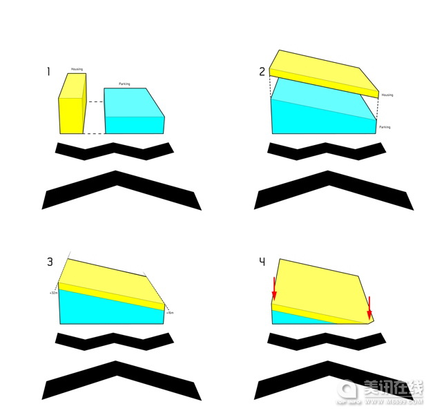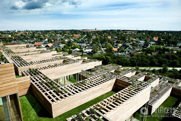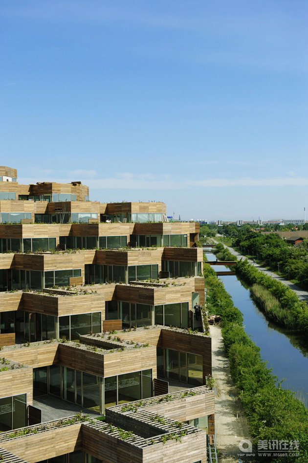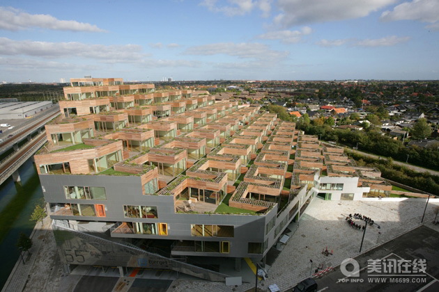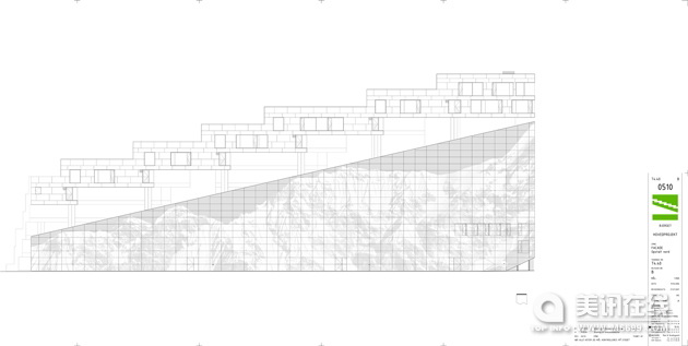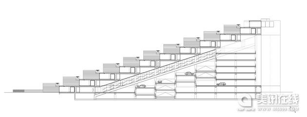 山居(The Mountain Dwellings)是VM Houses的第二期工程---同样的委托方、同样的面积、位于同一条街道。这个项目2/3是停车场,1/3为居住区。从项目截面图看,停车场呈斜坡状,自11楼其呈阶梯状往下一直延伸至一楼。而在这个水泥墙砌成的山坡上“覆盖”着“一层”薄薄的住宅楼。停车场与住宅区形成一种密切的互生关系---停车场需要与街道相连,而住宅楼则需要阳关、新鲜空气、开阔视野。如此设计可以同时解决停车场问题和住宅空间问题。每一个住户都可以享受到毫无遮挡的阳光和同样令人欣喜的开阔视野。