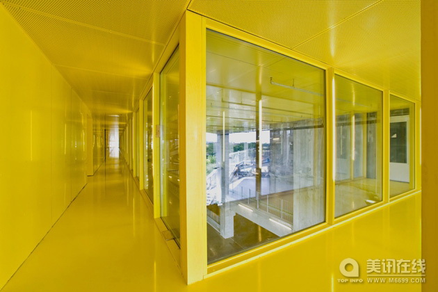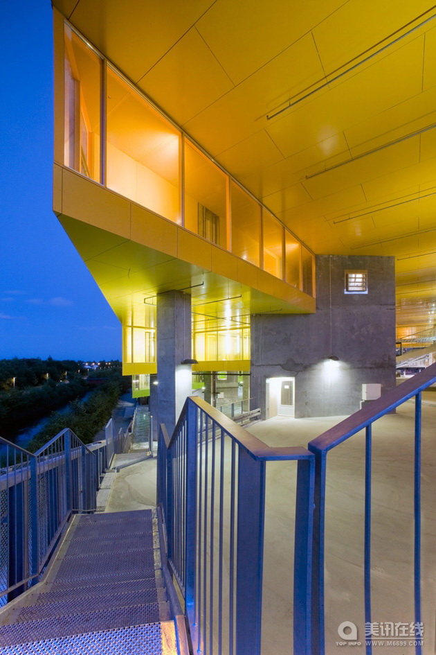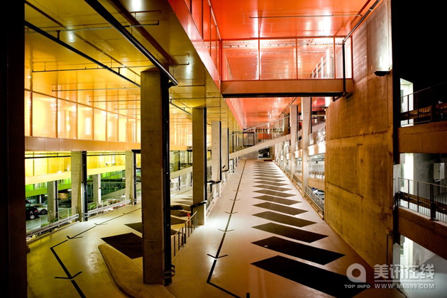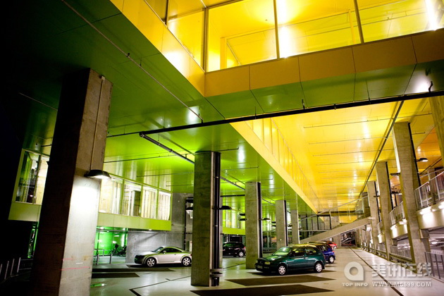 住宅区之下的停车场设有480个停车位,斜坡的车道从11楼缓缓往下,内部空间高度的内部空间最大高大16米,如同一个巨大的教堂般壮观。停车场北面和西面墙面为多孔铝板,便于停车场内空气的流通。