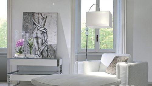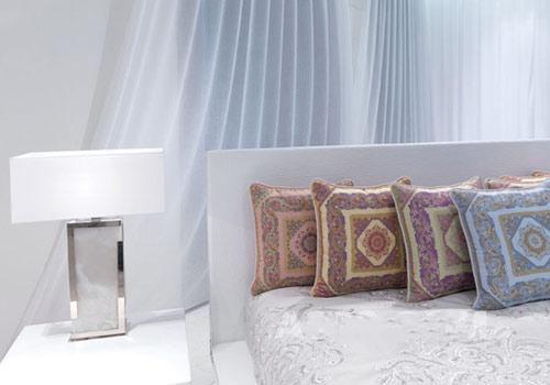 台灯Marble使用明亮的镀铬材质。提花靠垫的鲜艳色彩同整体的纯白环境形成鲜明对比。靠垫参考价格1500元起。