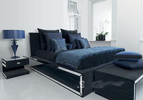 双人床和脚凳Greca,全部采用金属结构,外覆丝绒面料。双人床参考价格140000元,床头柜参考价格27000元。台灯Clessidra采用黑色水晶底座和真丝灯罩。参考价格25000元。